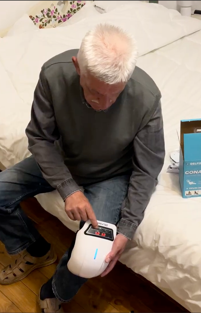 Fixați Gonartronul Delfino pe genunchi. Apăsați LUNG 10 SECUNDE pe butonul de start pentru a porni!